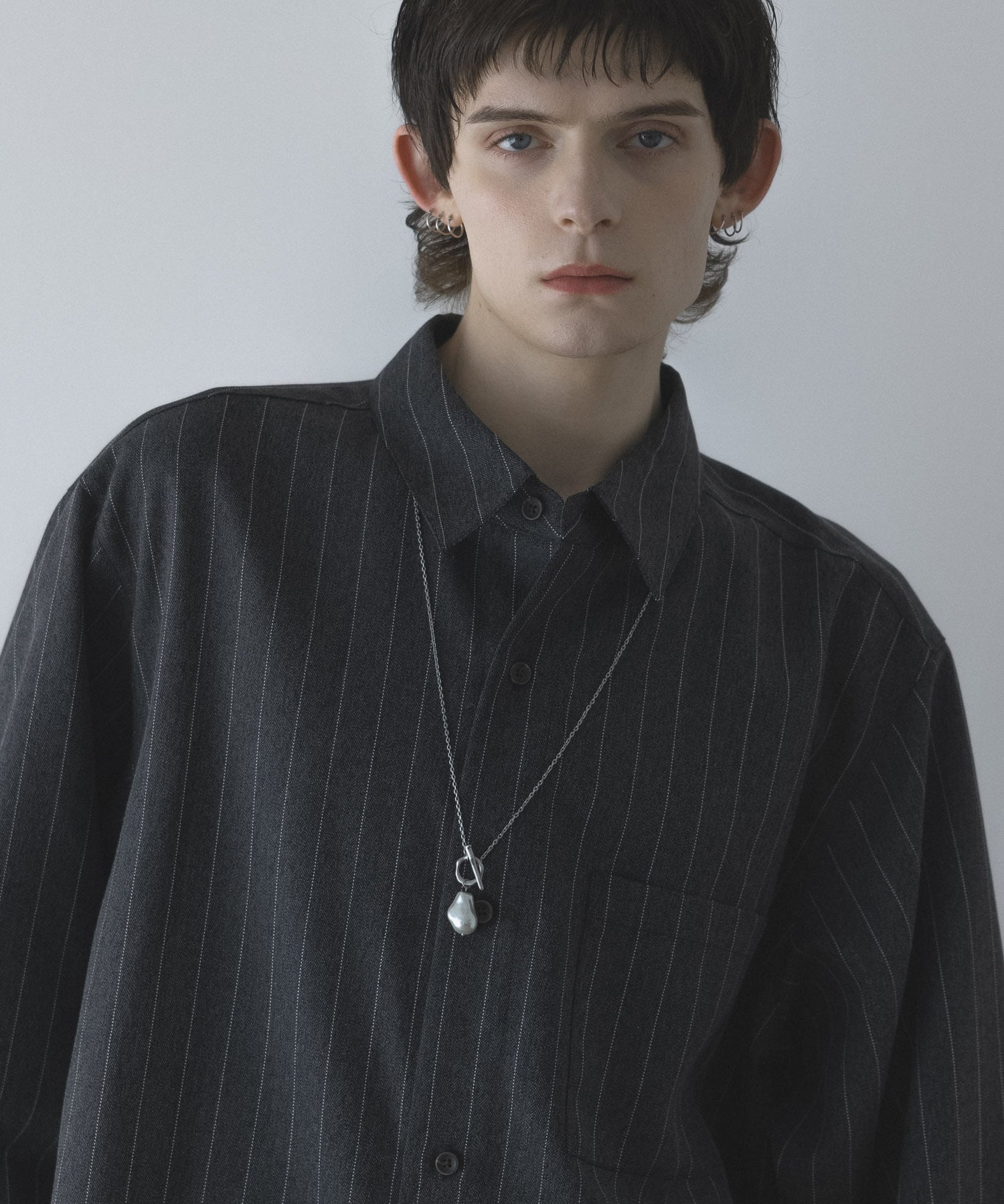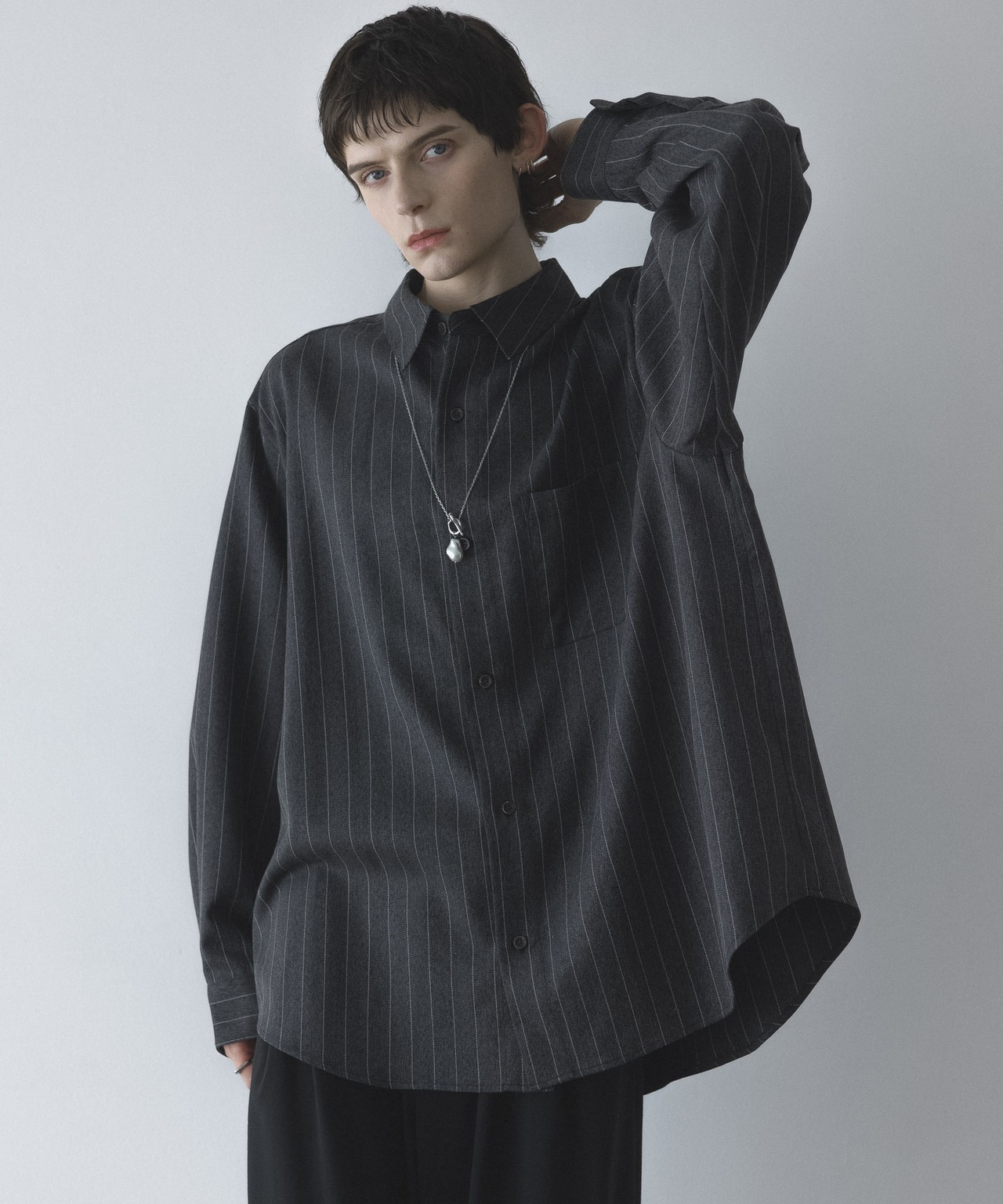 An oversized shirt with graceful drapes that respond to body movement and a fabric infused with heathered nuances, enhancing the wearer’s presence with elegance and allowing for refined styling across all seasons.