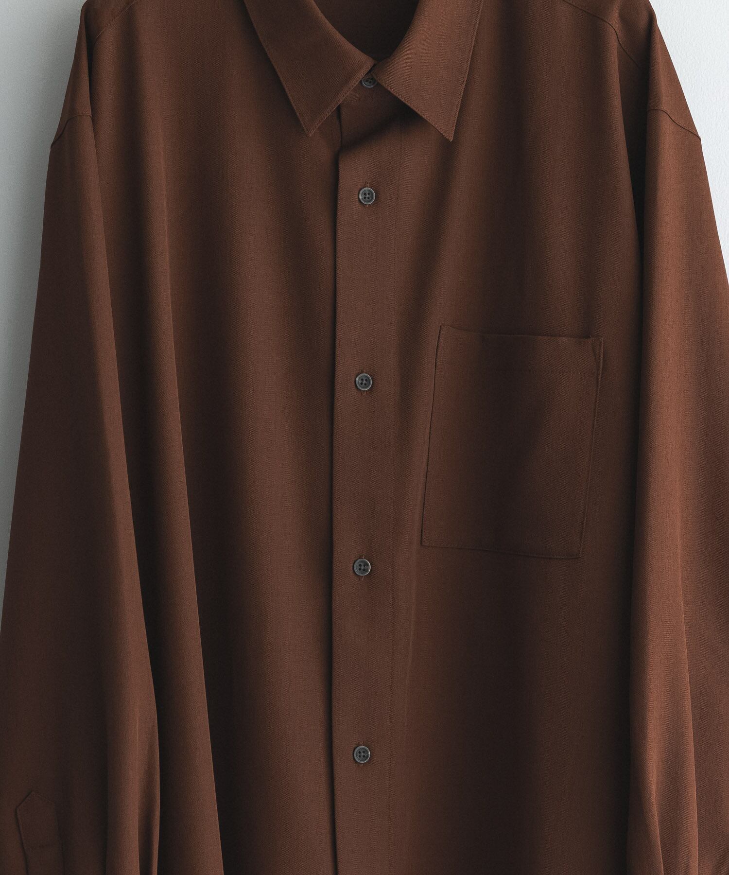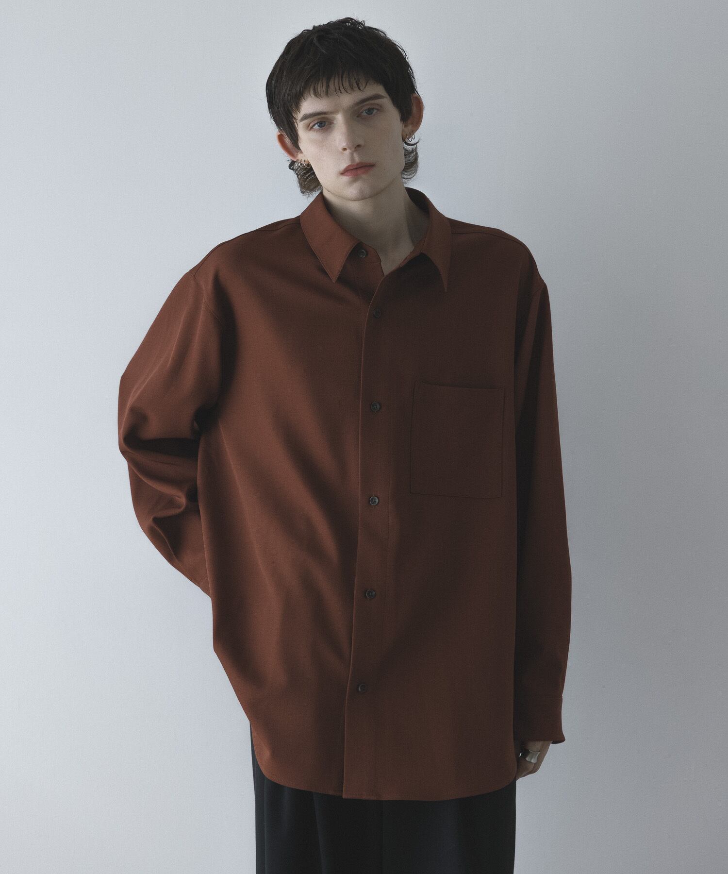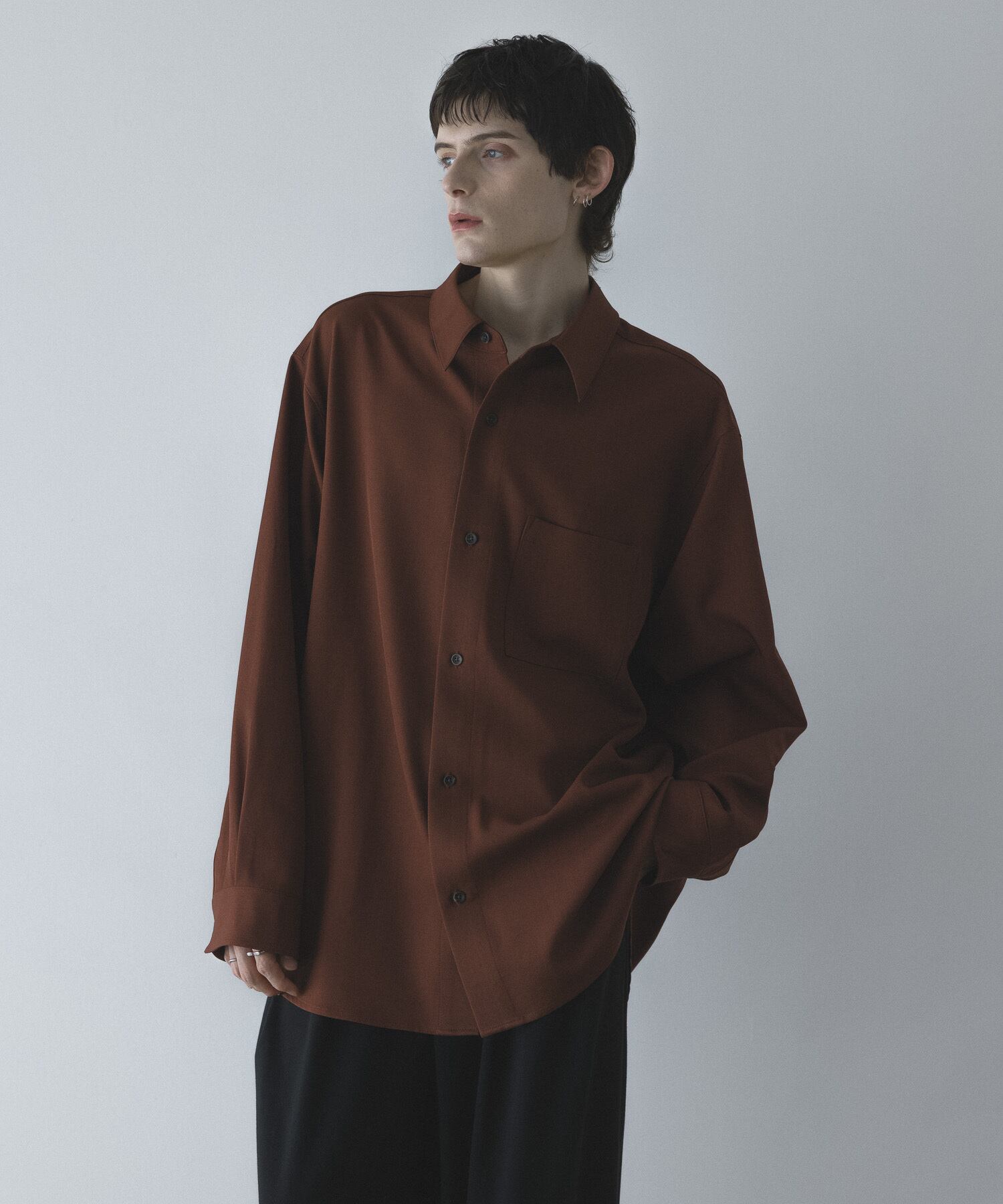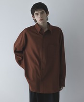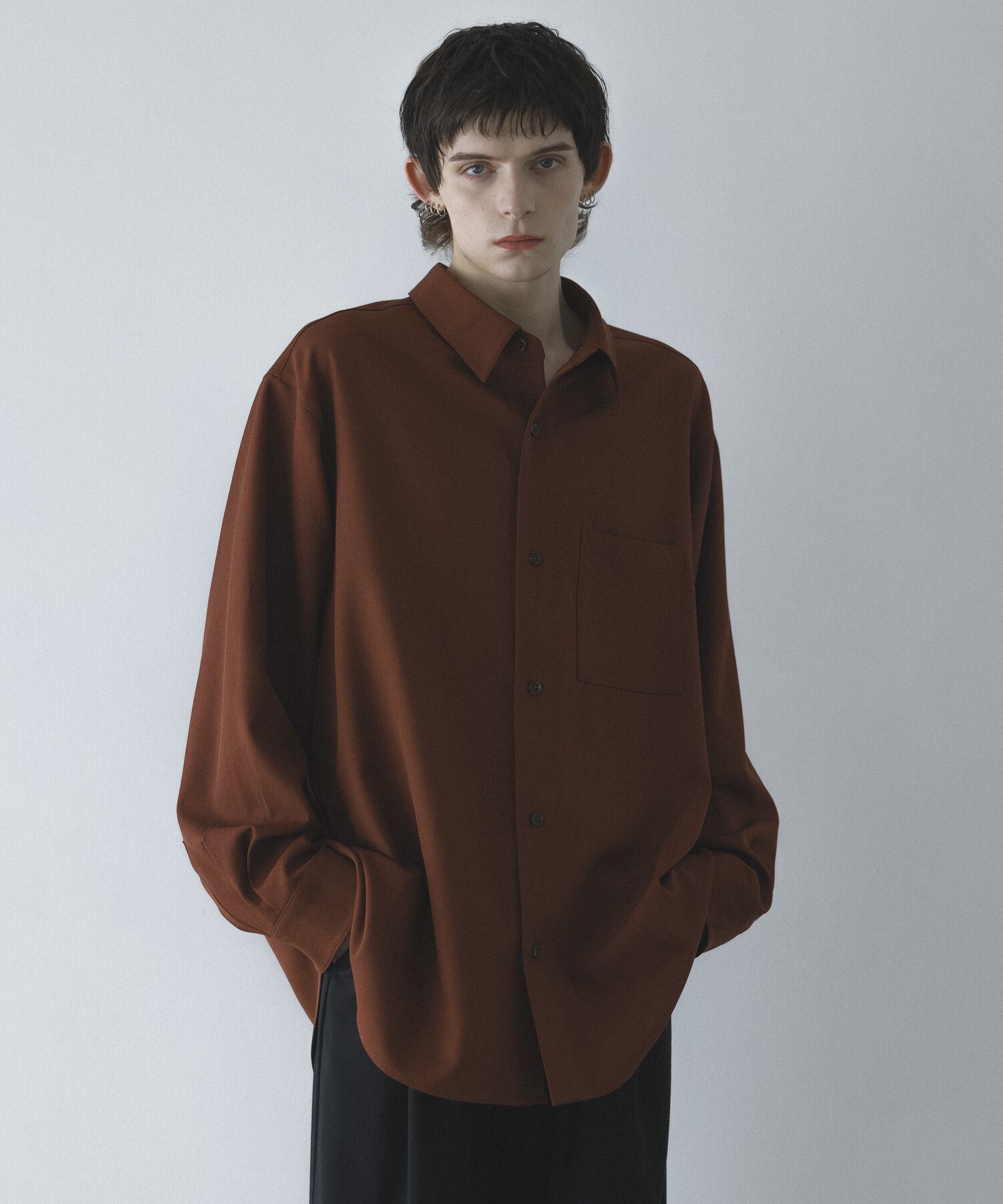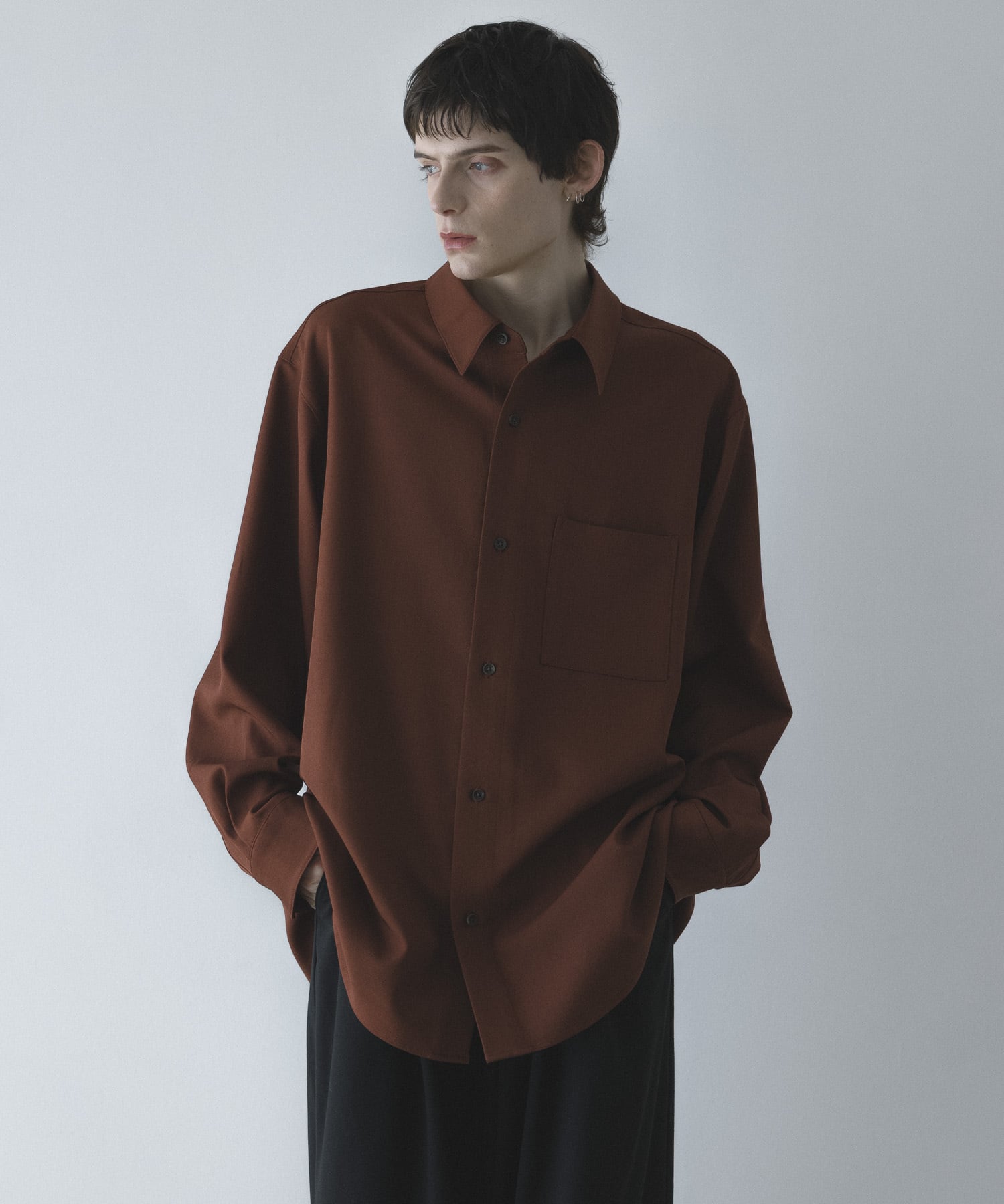 An oversized shirt with graceful drapes that respond to body movement and a fabric infused with heathered nuances, enhancing the wearer’s presence with elegance and allowing for refined styling across all seasons.
