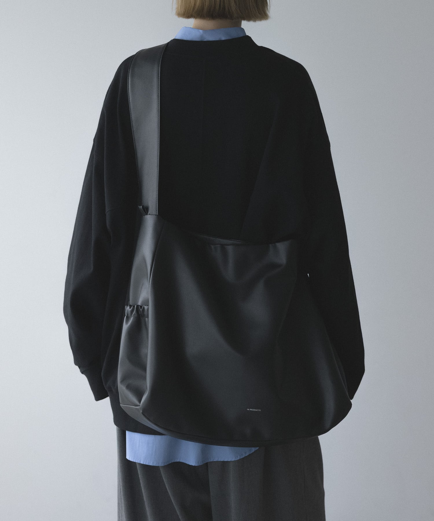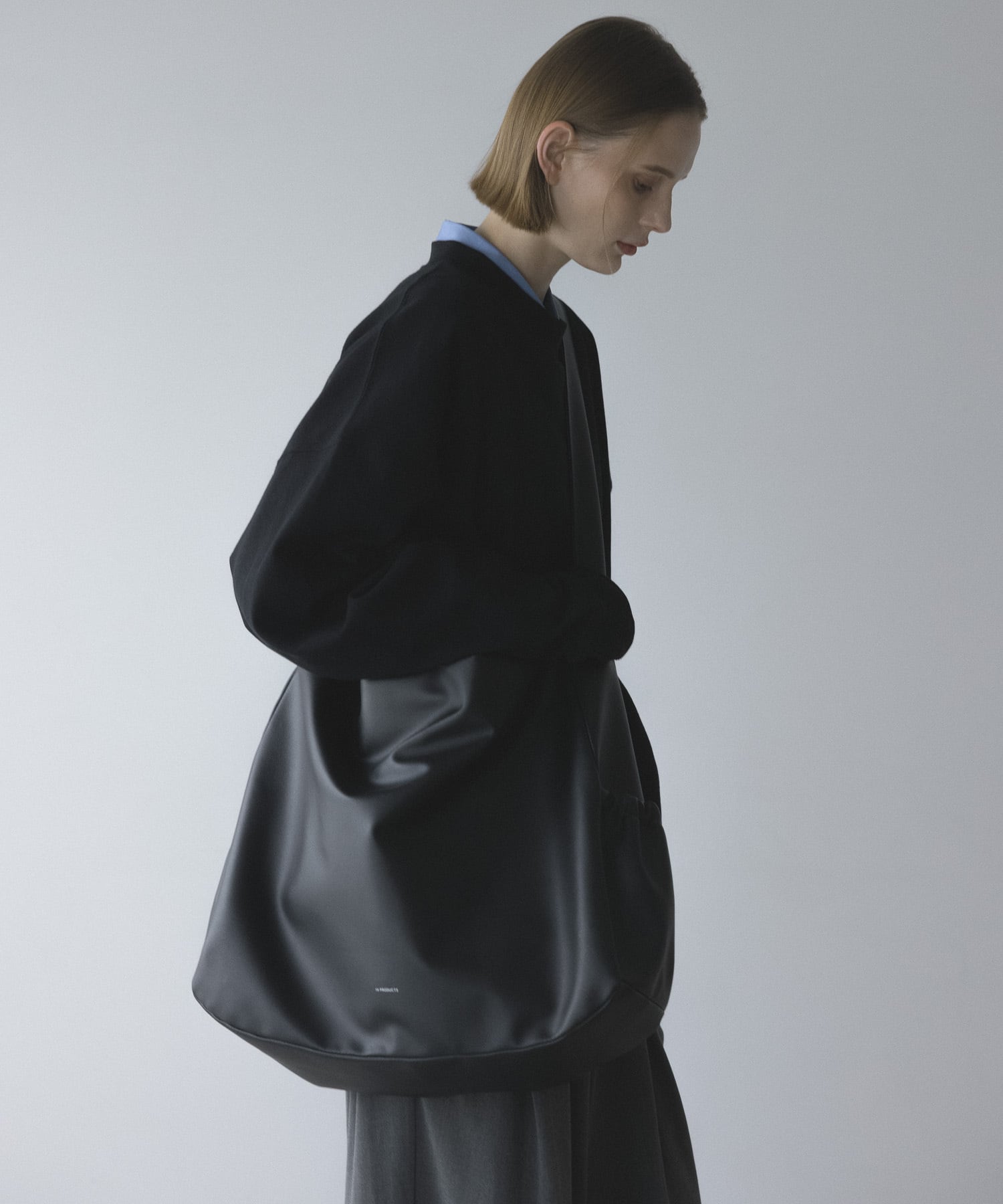 A shoulder bag crafted from premium synthetic leather. Along with a spacious main compartment offering ample storage, it features side sub-pockets with gathered detailing, adding a subtle touch of contemporary style without being overstated.