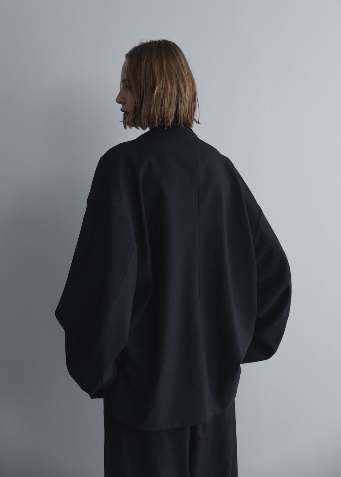 The relaxed shoulder line creates a natural drape from shoulder to sleeve, combining an effortless looseness with a commanding presence rarely found in traditional tailoring.