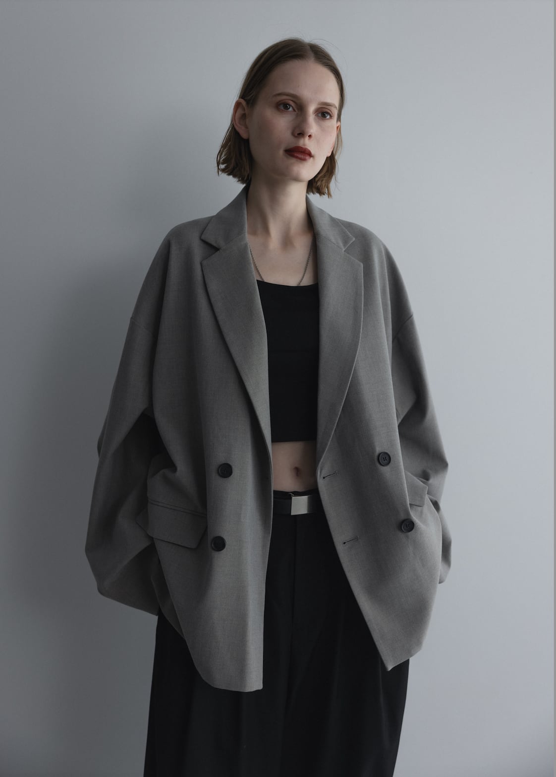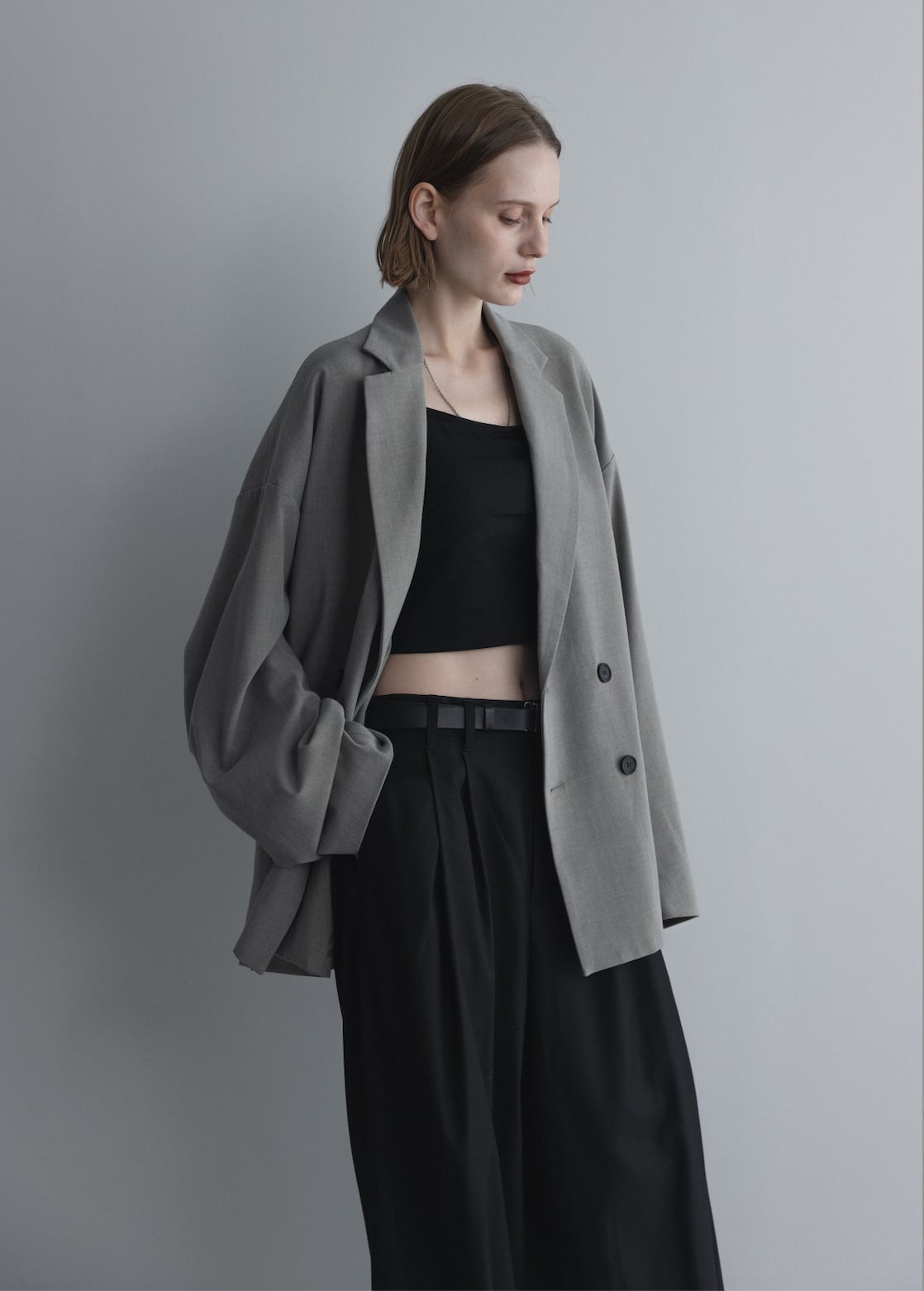 The relaxed shoulder line creates a natural drape from shoulder to sleeve, combining an effortless looseness with a commanding presence rarely found in traditional tailoring.