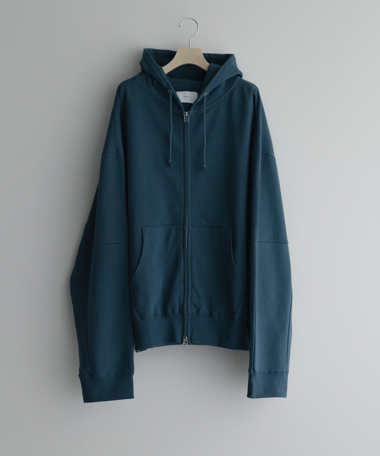 25AW Latest Zip Hoodie.Featuring a wide-sleeve design that embraces generous volume, this piece is crafted from a 400g/㎡ fleece body that balances substantial weight with comfort, creating a beautifully structured silhouette.