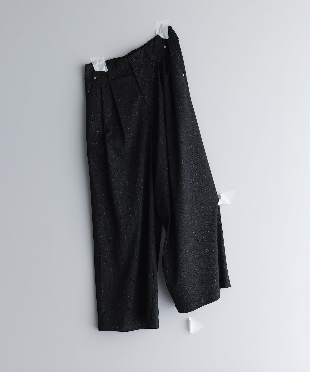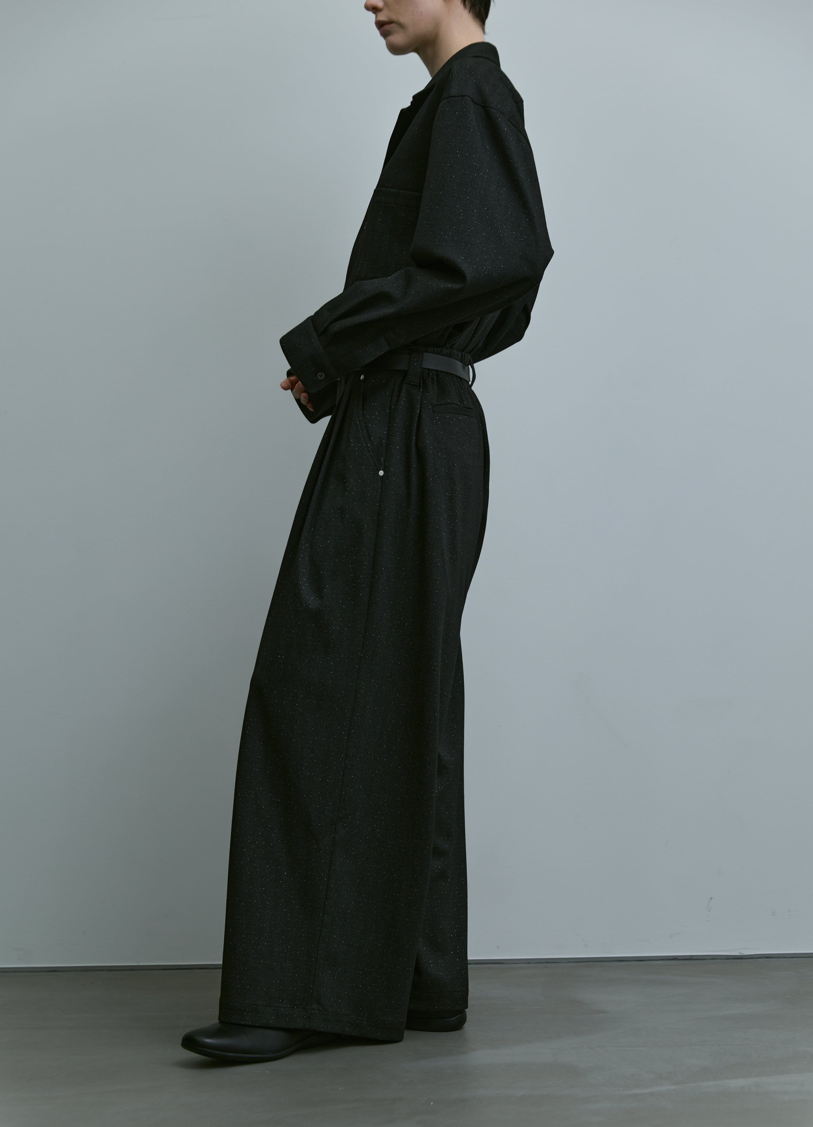 Based on our signature baggy pants silhouette, these wide pants are crafted using a herringbone fabric woven with subtle lamé threads.