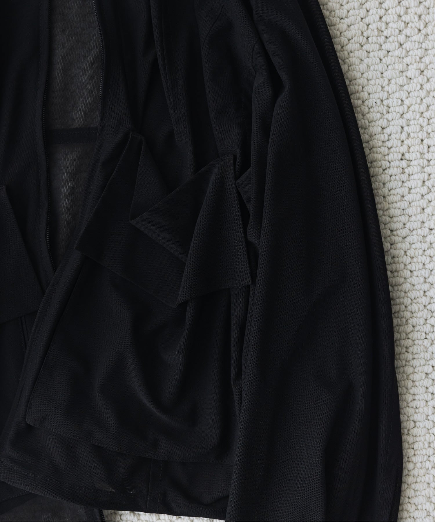 A track jacket constructed using a delicate micro-mesh fabric. Finished with an elevated textile that goes beyond a purely sporty impression.