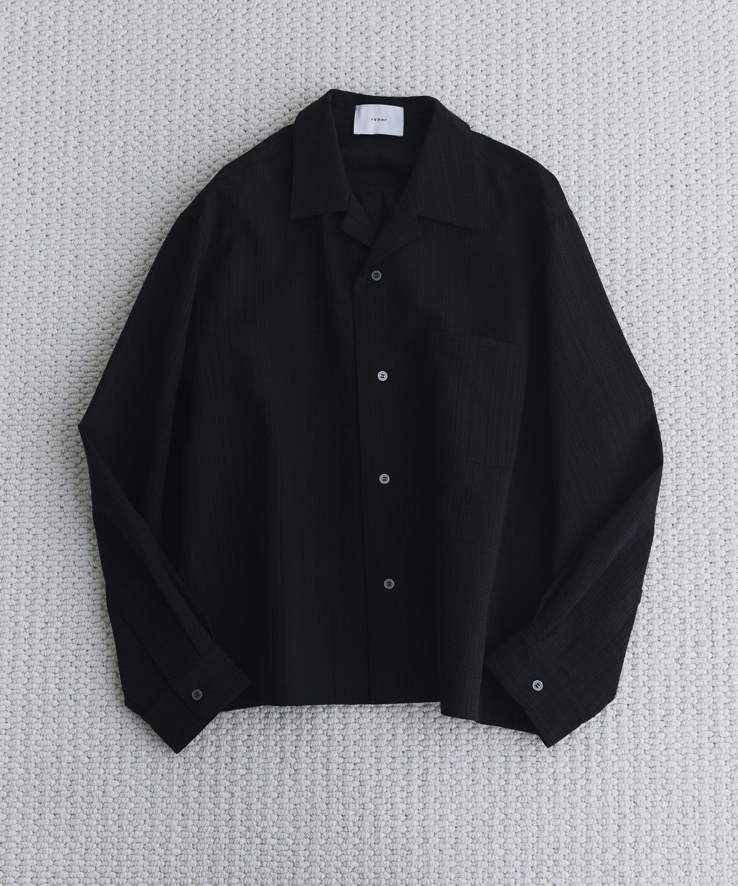 A new oversized shirt featuring a seersucker-like textured fabric. The subtly uneven, three-dimensional surface adds a refined accent, while its bubble-like touch offers a distinctive feel.