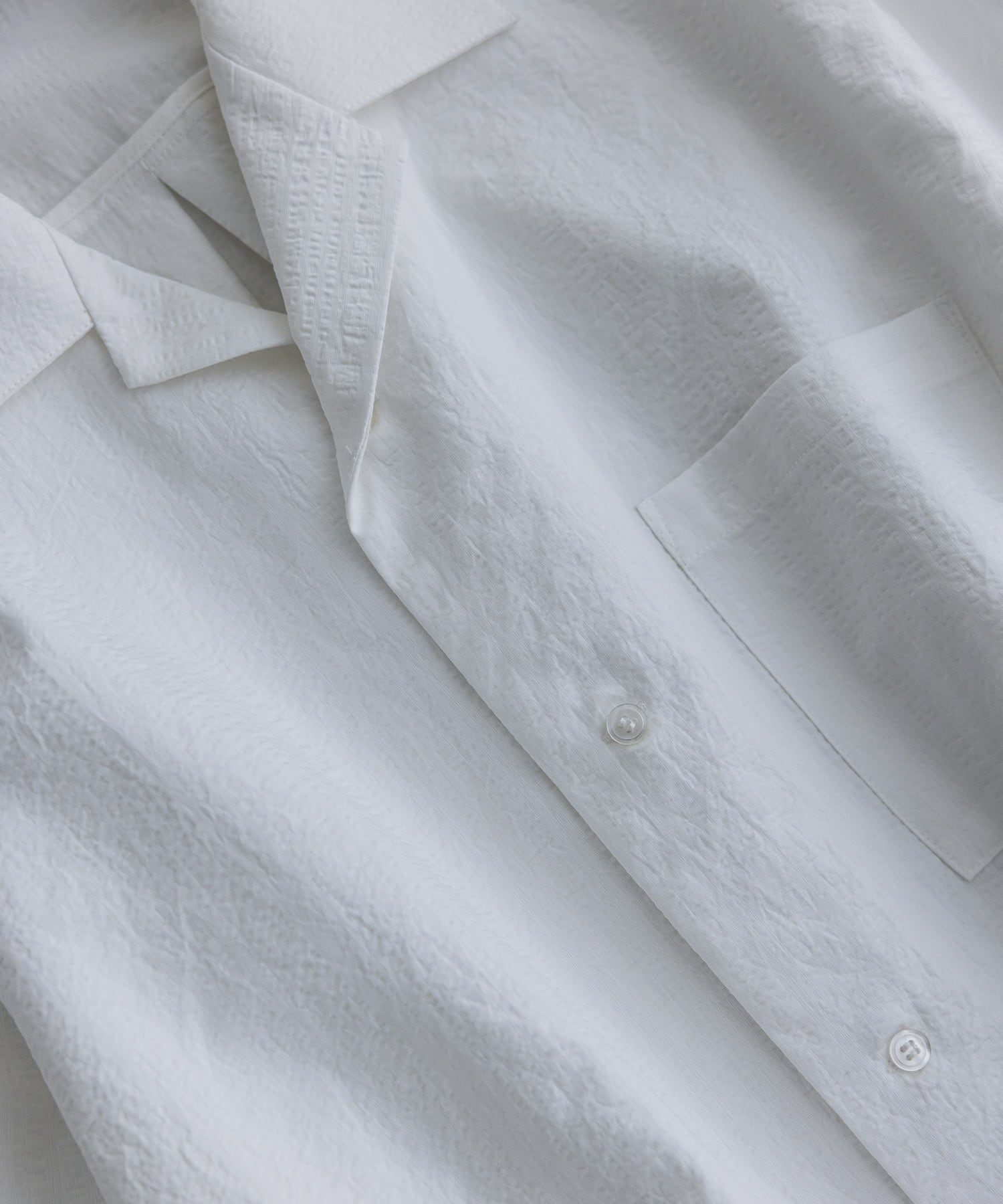 A new oversized shirt featuring a seersucker-like textured fabric. The subtly uneven, three-dimensional surface adds a refined accent, while its bubble-like touch offers a distinctive feel.
